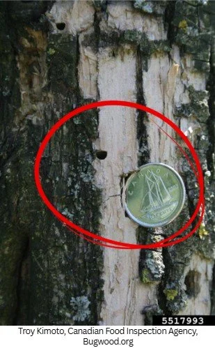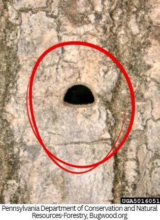 D-shaped insect exit holes in tree bark. They are roughly 1/8” in size. Note, there are other wood-boring insects that can cause exit holes in ash trees. Only the D-shape is specific to and characteristic of the Emerald Ash Borer beetle.