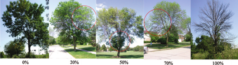 Overall thinning of tree canopy. EAB activity mostly takes place in the higher parts of the ash tree canopy. Research supports noted changes of leaf colour from deep green to lighter coloured leaves and smaller leaf size. See gradual canopy thinning images below (source: Smitley et al., 2008).