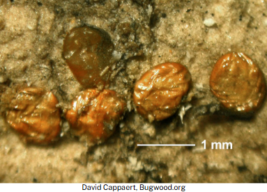 Egg masses found in the cracks and crevices of the tree bark. They are roughly 1 mm in size.