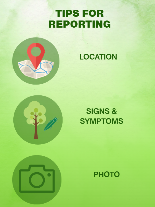 If you suspect an ash tree has symptoms and/or signs of emerald ash borer, there are a few ways to report your concerns: